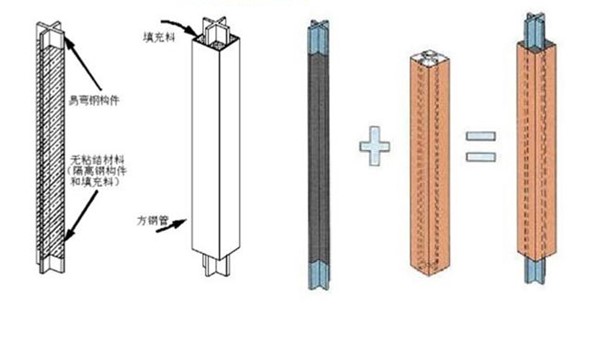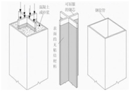 由于泊松效应的存在,芯材受压时会发生膨胀,故在芯材和填充料(砂浆、配方混凝土等)之间设置有一层无粘结材料或非常狭小的空气层,可以减小或消除芯材承受轴向力时传递给填充料(砂浆或混凝土)和外套管的力,也即外围约束机制是不承受轴向荷载作用。